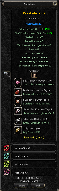 | Efsane Evrim +70 STR | 4x Kırmızı , x4 Mavi , x4 Mor x4 Yeşil ot ve Evrim Metali karşılığında yapılır 150m yang ister |
