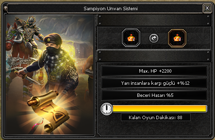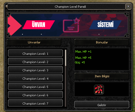 | Şampiyon Ünvan | +15 Yarı İnsan 3500 Max HP 6 Beceri Hasarı |